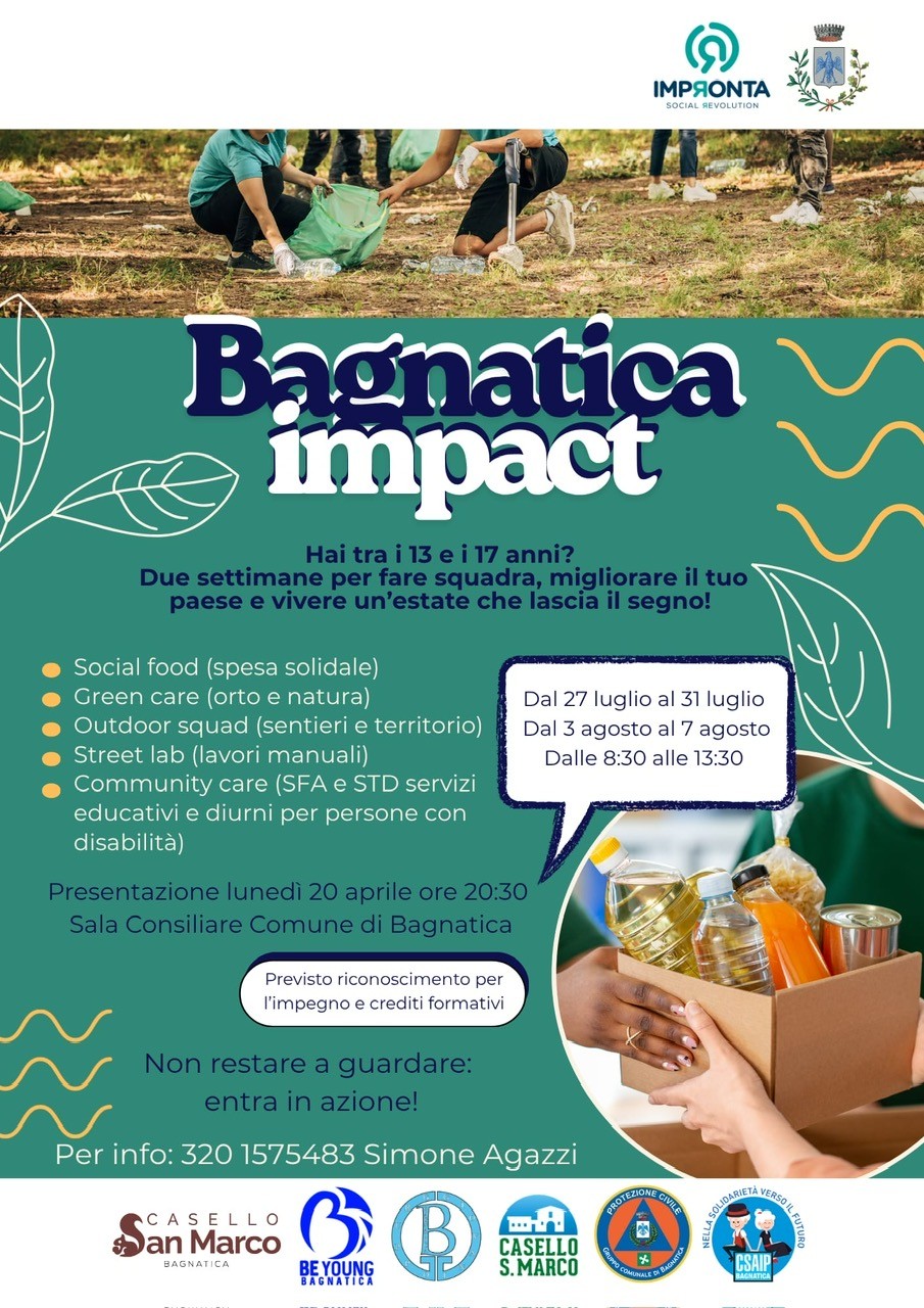 Il Comune di Bagnatica, in collaborazione con l'Associazione Impronta e le realtà del territorio, lancia Bagnatica Impact, un progetto dedicato ai ragazzi e alle ragazze di età compresa tra i 13 e i 17 anni.