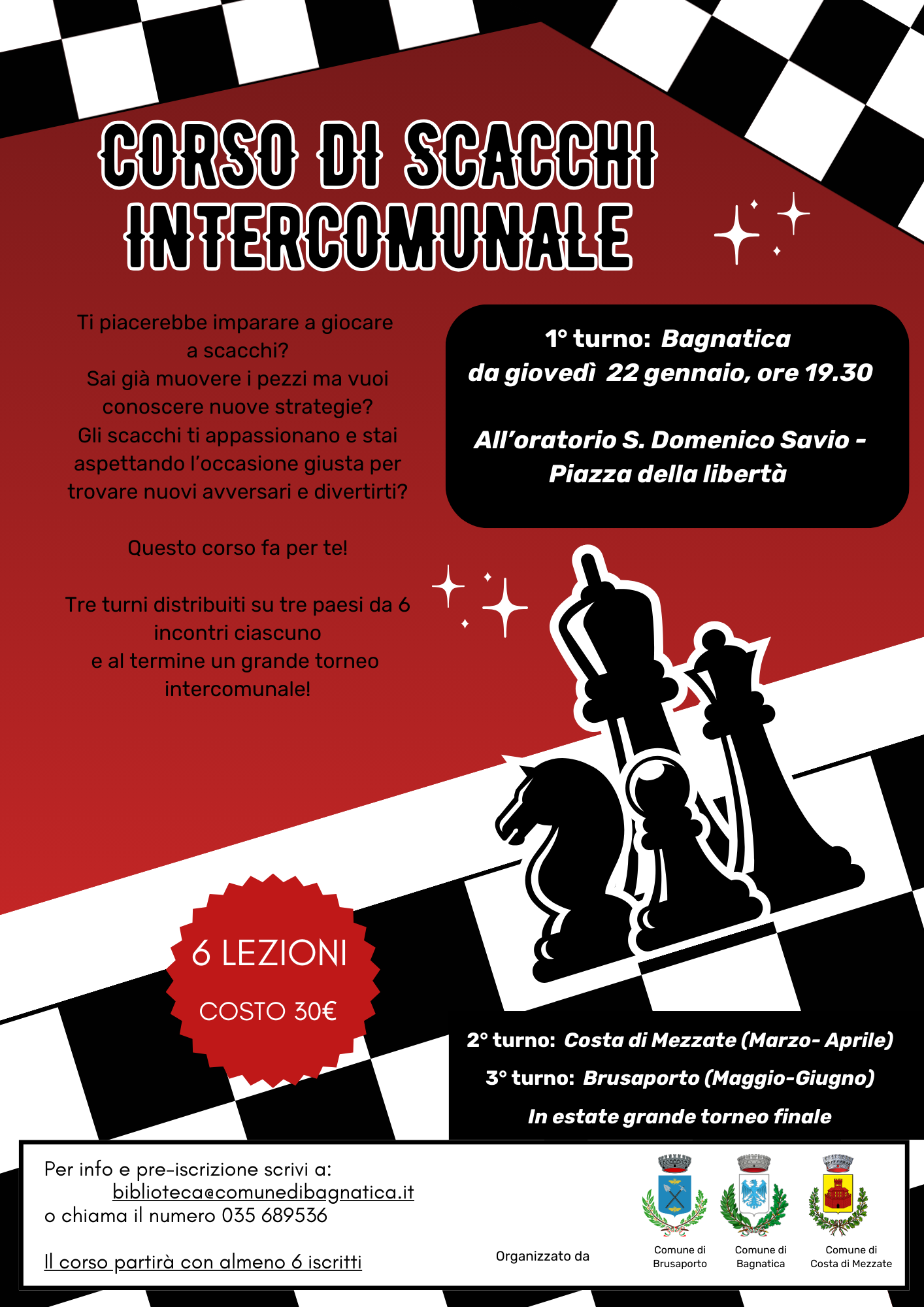 Per informazioni e pre-iscrizioni: rivolgersi alla biblioteca comunale di riferimento oppure scrivere a biblioteca@comunedibagnatica.it o telefonare al numero 035 689536Un’occasione per imparare, migliorarsi, conoscere nuovi avversari e vivere gli scacchi come momento di incontro e divertimento all’interno della comunità.