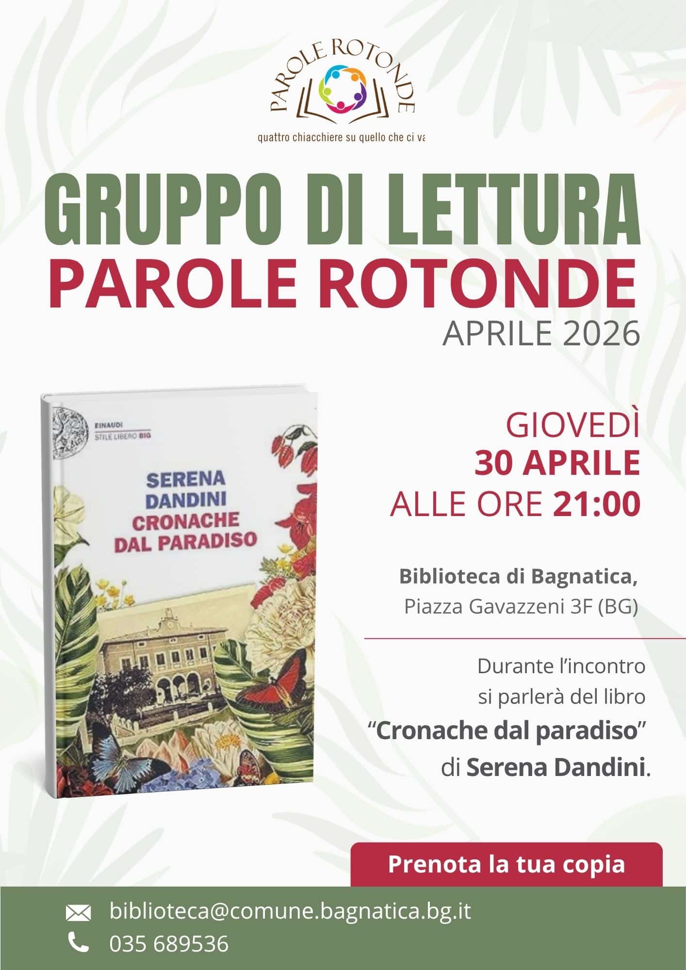 Giovedì 30 Aprile, alle 21:00, la Biblioteca di Bagnatica in Piazza Gavazzeni 3F ospita il gruppo di lettura "Parole Rotonde". Un incontro pubblico dedicato al libro "Cronache dal paradiso" di Serena Dandini. Ingresso libero.