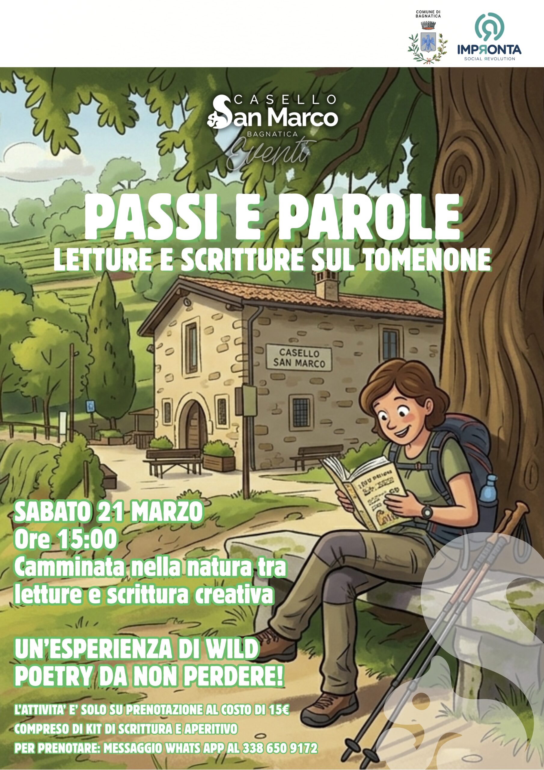 Il Comune di Bagnatica, in collaborazione con Casello San Marco e l'associazione Impronta, invita la cittadinanza a un evento unico che coniuga il benessere del camminare all'aria aperta con il fascino della letteratura."Passi e Parole" è un'esperienza di Wild Poetry (poesia della natura) pensata per chi vuole riscoprire il territorio del Monte Tomenone attraverso la lettura e l’espressione creativa. Un pomeriggio per rigenerarsi, lasciandosi ispirare dal paesaggio e dal silenzio della natura.